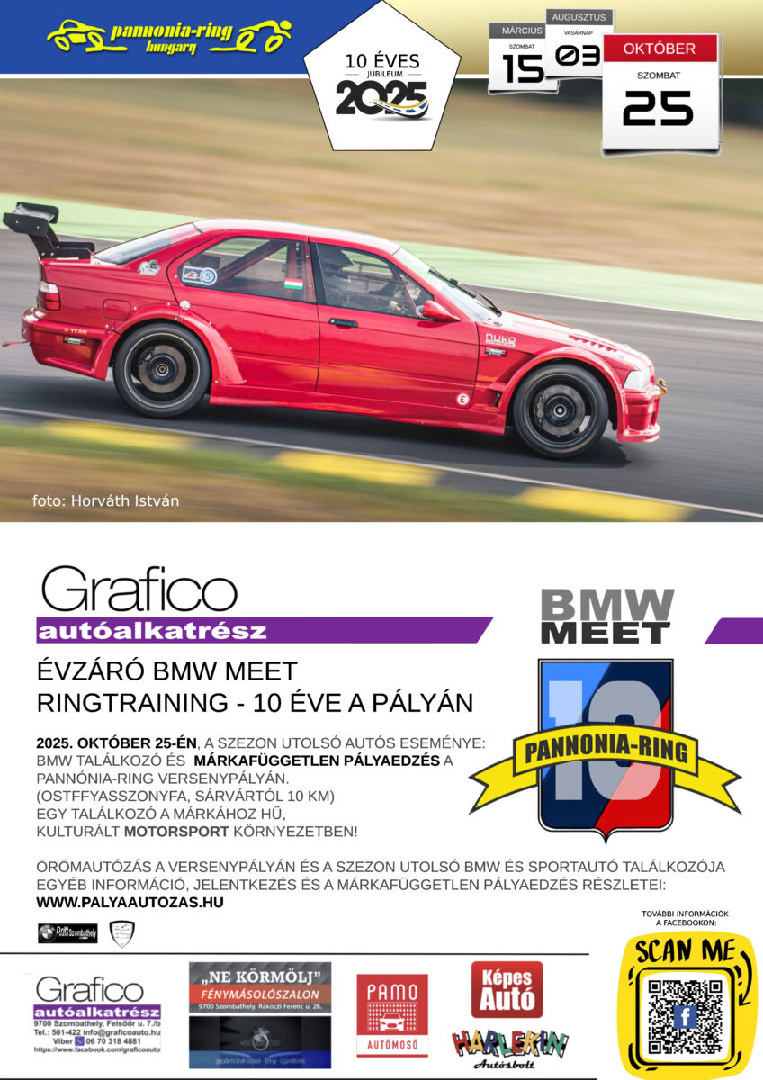 2025. október 25-én, szombaton, szezon záró BMW MEET és MAGYAR autós nyílt-nap a Pannónia-Ringen! Friss levegő, szép kocsik, pályázás, fiúk, lányok szabadtéren az utolsó szezon záró napsütésben! Rendezvénysorozatunk 2025-ben 10. “életévébe” lép! 2015 márciusában hívtuk össze első ízben a pályázás és a BMW-k szerelmeseit egy akkor még csupán egy közeli-baráti találkozóra a Pannónia-Ringre. Célunk az volt, hogy egy kulturált versenypálya környezetben „bandázzunk”, ahol aki akar, pályára is viheti autóját megfizethető feltételek és teljesíthető szabályok keretei között. Köszönjük, hogy évről évre velünk tartotok, hisz NEKTEK köszönhetően immár 10 éve tudjuk fenntartani eseményünket ugyan ezen célokat szem előtt tartva! Az évtized során “megküzdöttünk” a világjárvány korlátozásaival, a háborús időszak gazdasági félelemkeltésével, forintunk árfolyamveszteségeivel és most szembenézünk a technikai sportrendezvények korlátozásaival, szigorításaival. De tudjátok mit? Minden perc, minden esemény megérte, mert szeretjük ezt a társaságot és IDÉN IS PÁLYÁRA LÉPÜNK!!! Március 15-én kezdünk egy bemelegítő eseménnyel, augusztus 3-án szeretnénk egy jubileumi kiemelt napot tartani, ahova meglepetés programokat is tervezünk és október 25-én együtt zárjuk az autós szezont az idei utolsó találkozónkkal! Tartsatok velünk mindhárom alkalommal, várunk benneteket! Elő a vasakkal márciusban irány a Pannónia-Ring!