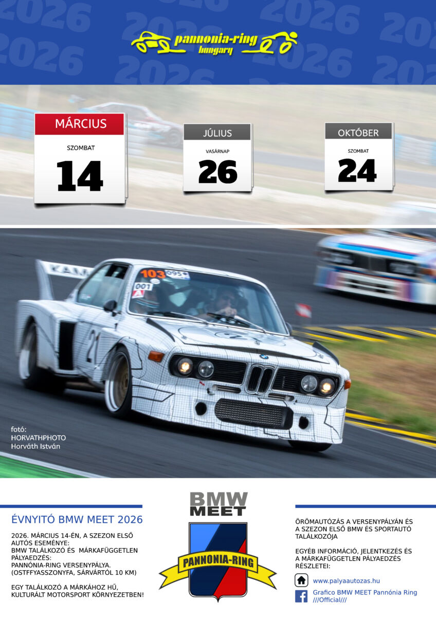 2025. március 14-én, szombaton, szezon nyitó BMW MEET és MAGYAR autós nyílt-nap a Pannónia-Ringen! Friss levegő, szép kocsik, pályázás, fiúk, lányok szabadtéren az első tavasz köszöntő napsütésben! 🙂